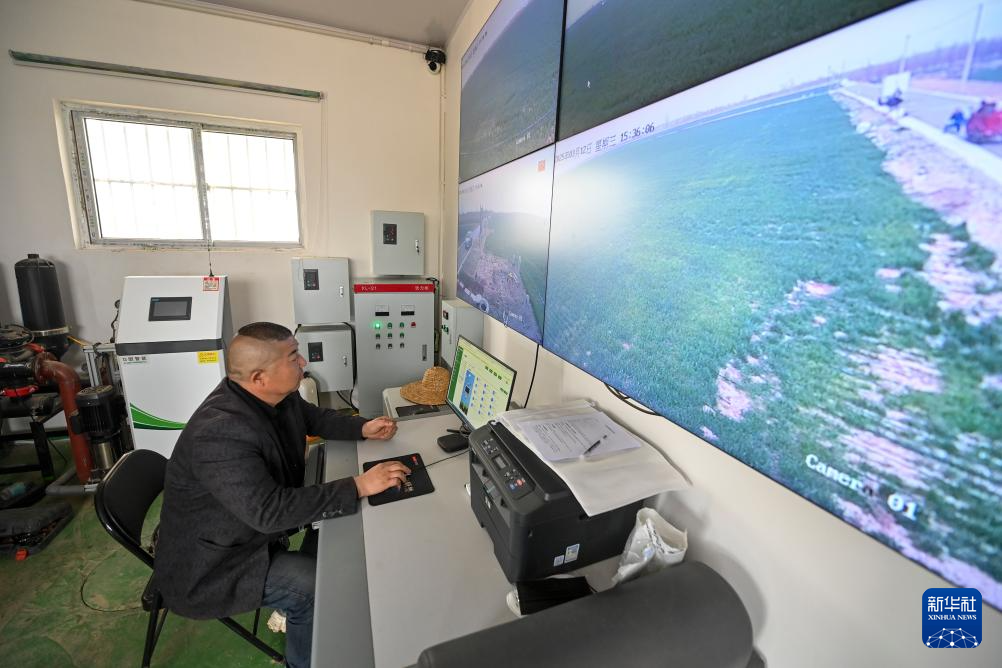 在运城市盐湖区解州镇曲村,农户董会龙通过智慧农业物联网系统查看农作物生长情况(3月12日摄)。