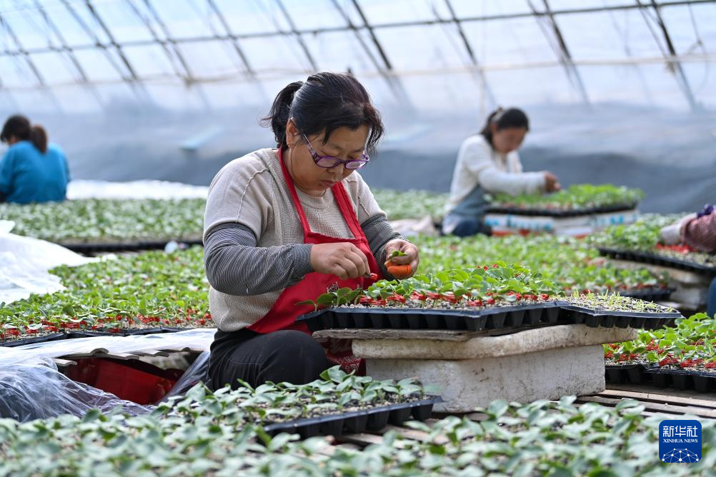3月13日,在位于运城市新绛县泉掌镇王守庄村的山西瑞恒农业股份有限公司蔬菜高新技术示范园内,工作人员在嫁接种苗。