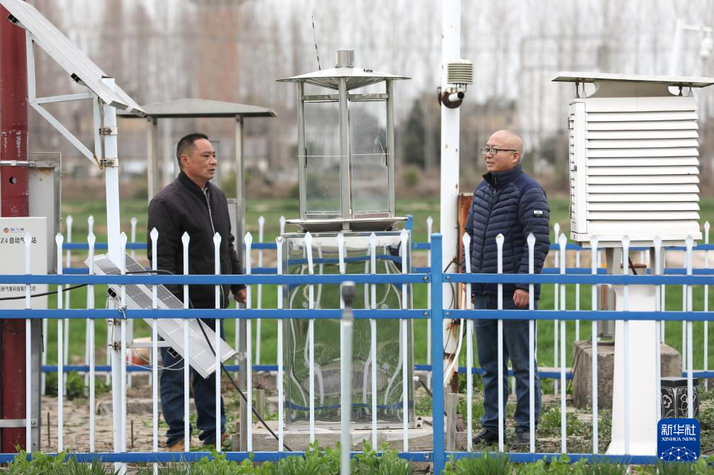 3月14日,在江苏省淮安市洪泽区三河镇智慧农田里,种植户利用气象观测站和智能虫情测报系统,查看土壤墒情和虫情等情况。