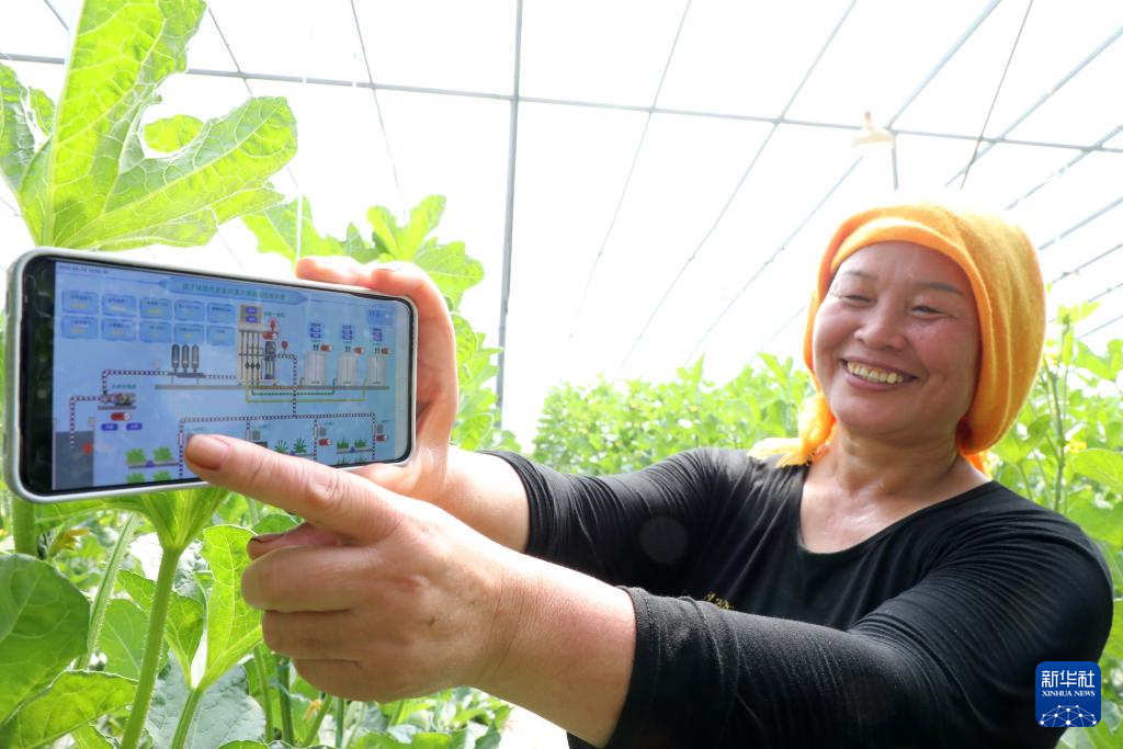 3月13日,在山东省滨州市博兴县店子镇大杨村,农民通过操作安装在手机上的“现代农业远程控制系统”软件管护蔬菜大棚。