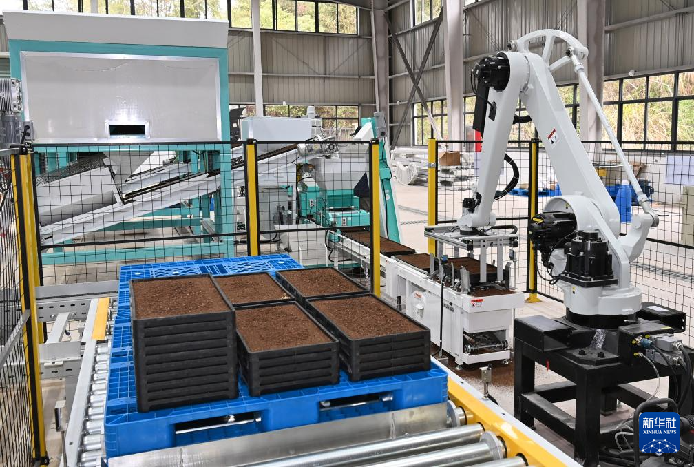 3月13日,浙江省东阳市皇野生态农业有限公司现代农事服务中心,全自动智能水稻育秧生产线在制作秧盘。