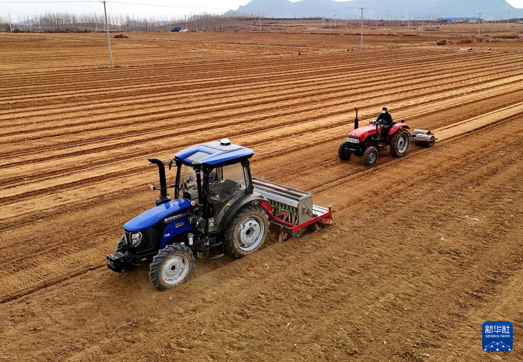 3月14日,在河北省秦皇岛市抚宁区茶棚乡背阴铺村,北斗导航无人驾驶播种机(左)在田地间作业(无人机照片)。