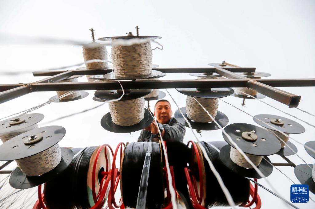 3月14日,河北省遵化市东新庄镇一家农机合作社的驾驶员在整理线式播种机的种子线盘,准备作业。