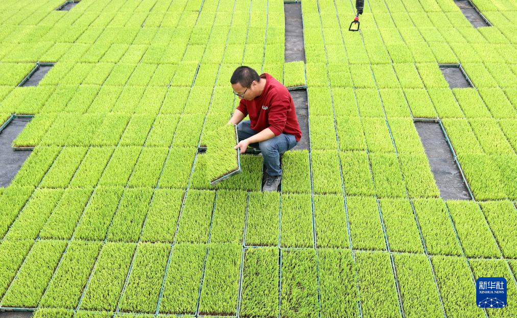 3月13日,在河南省信阳市光山县罗陈乡张楼村青龙河合作社,农民在全自动智能化育秧工厂育秧苗。