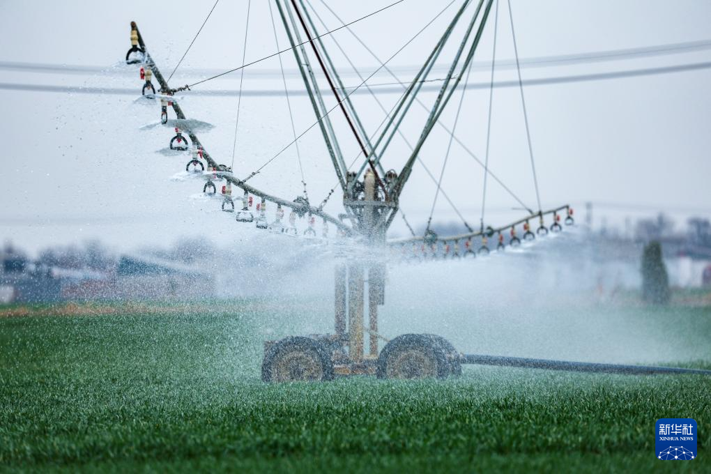 3月14日,河北省石家庄市栾城区天亮合作社采用桁架式灌溉机进行节水喷溉,促进冬小麦返青。