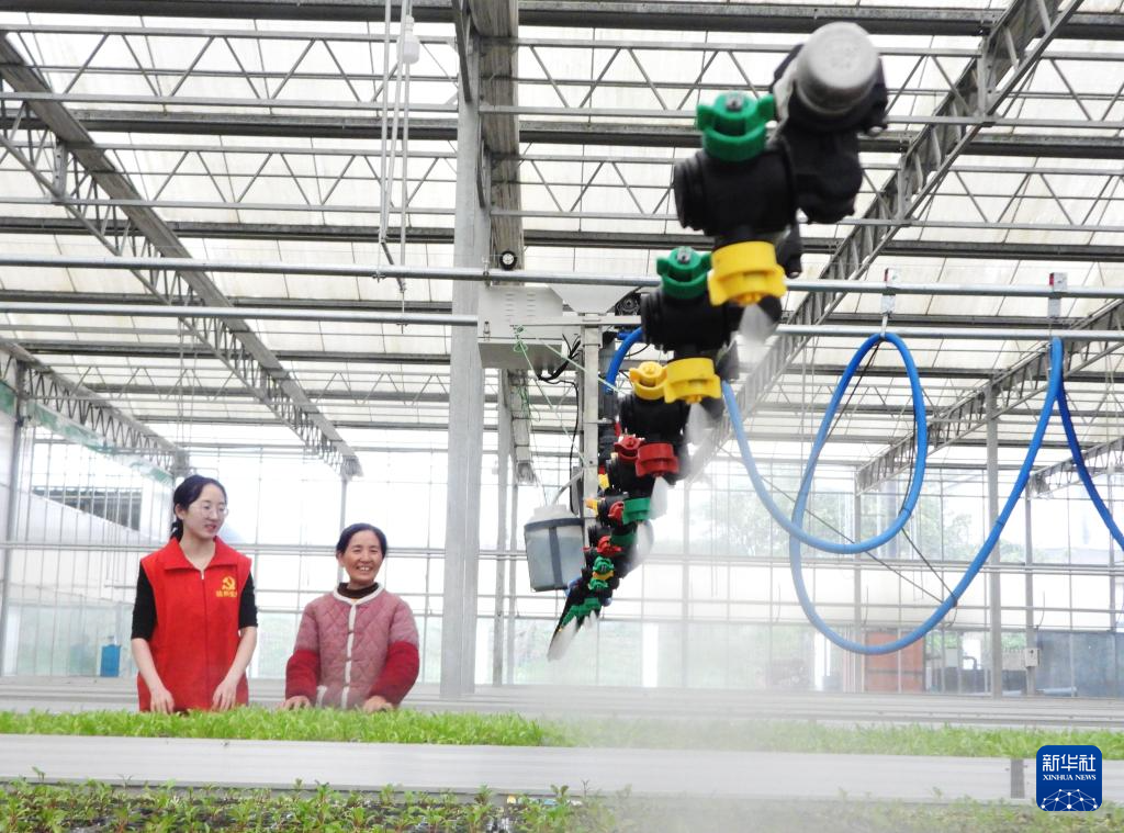 3月14日,在四川省达州市达川区双庙镇二东村蔬菜现代农业园区的“数字育苗工厂”内,农技员利用智能灌溉系统进行辣椒苗喷淋作业。