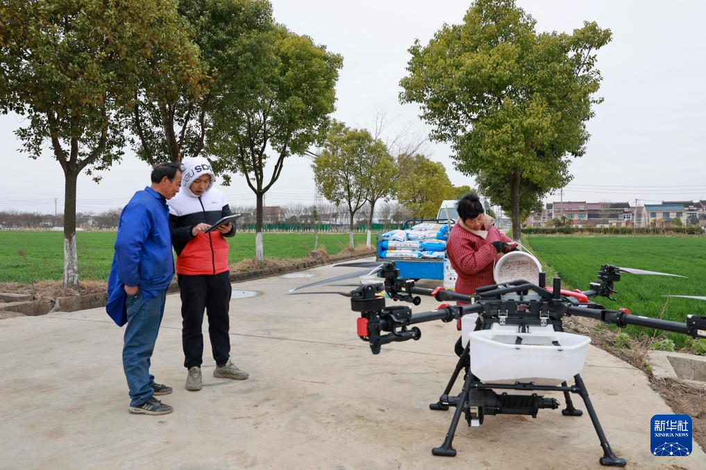 3月13日,江苏省泰兴市根思乡李秀河村,植保无人机工作人员在指导农民操作无人机进行小麦田间施肥。