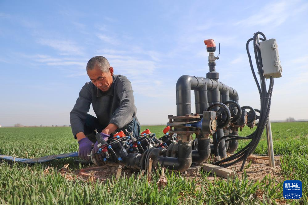3月13日,在山东潍坊高密市大牟家镇一家庭农场,农民在麦田间调试自动化滴灌设备。
