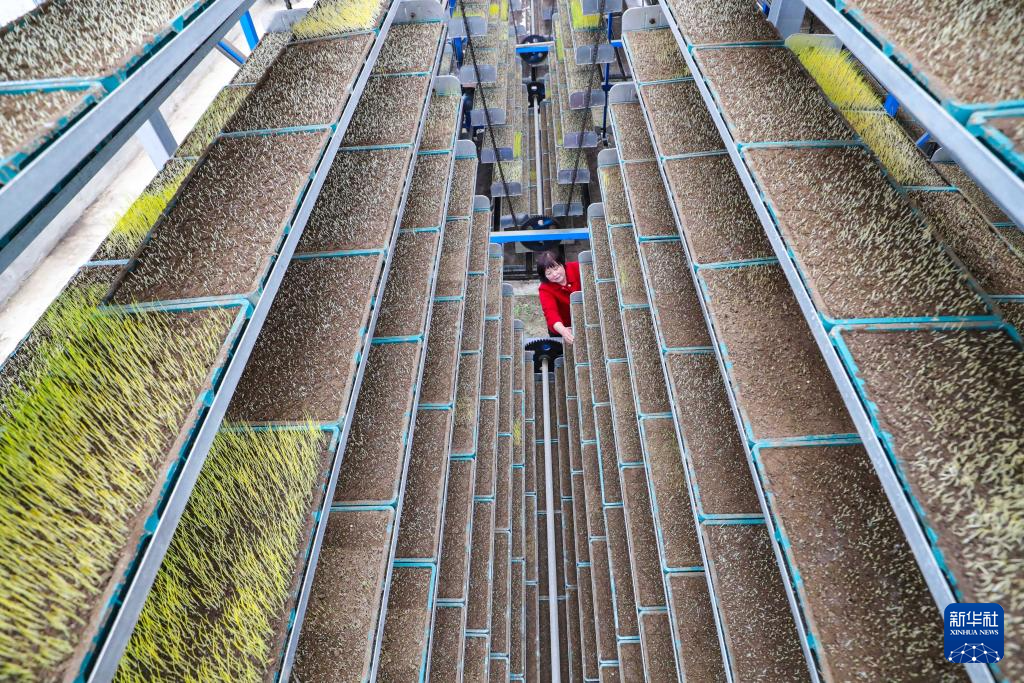 3月14日,浙江省湖州市德清县洛舍镇东衡村先丰农业智能育秧工厂内,工人在观察早稻秧苗长势。
