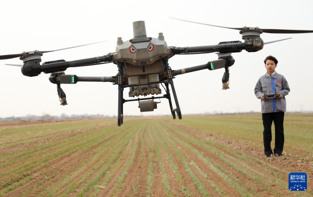 3月14日,在河北省沧州市沧县兴济镇赵庄子村,沧县鑫翰种植专业合作社里的工作人员操作无人植保机喷洒农药。