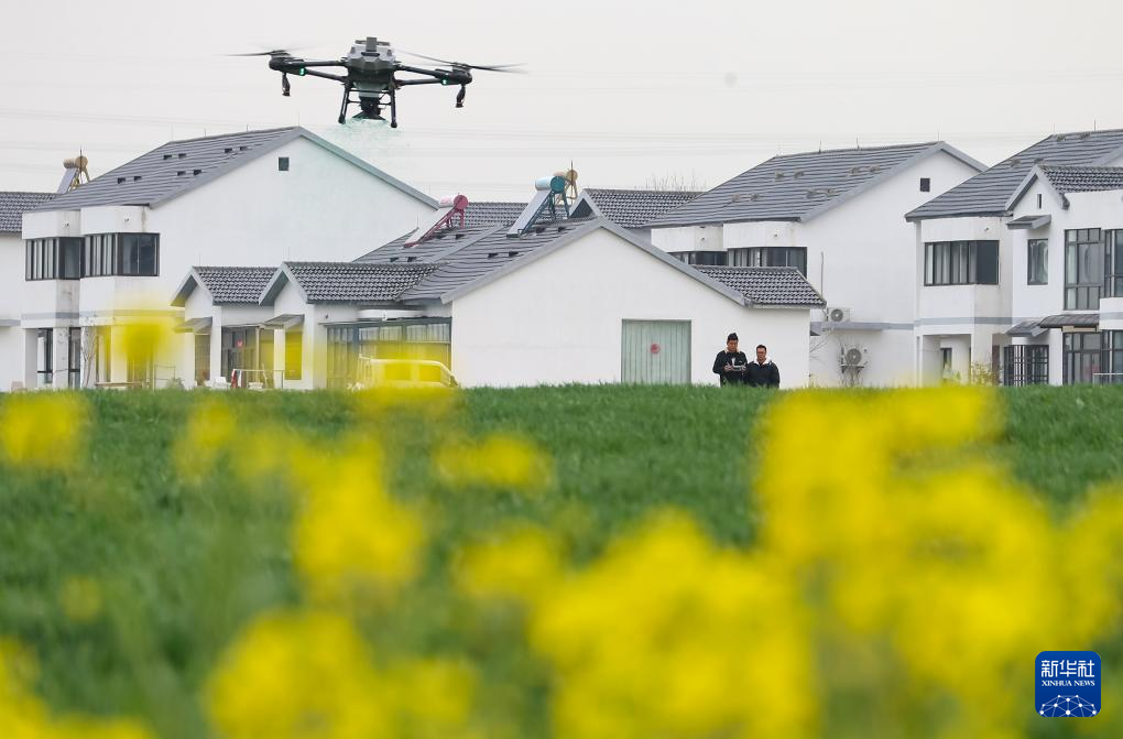 3月14日,农民操作植保无人机在江苏省句容市茅山镇何庄村麦田里施肥。