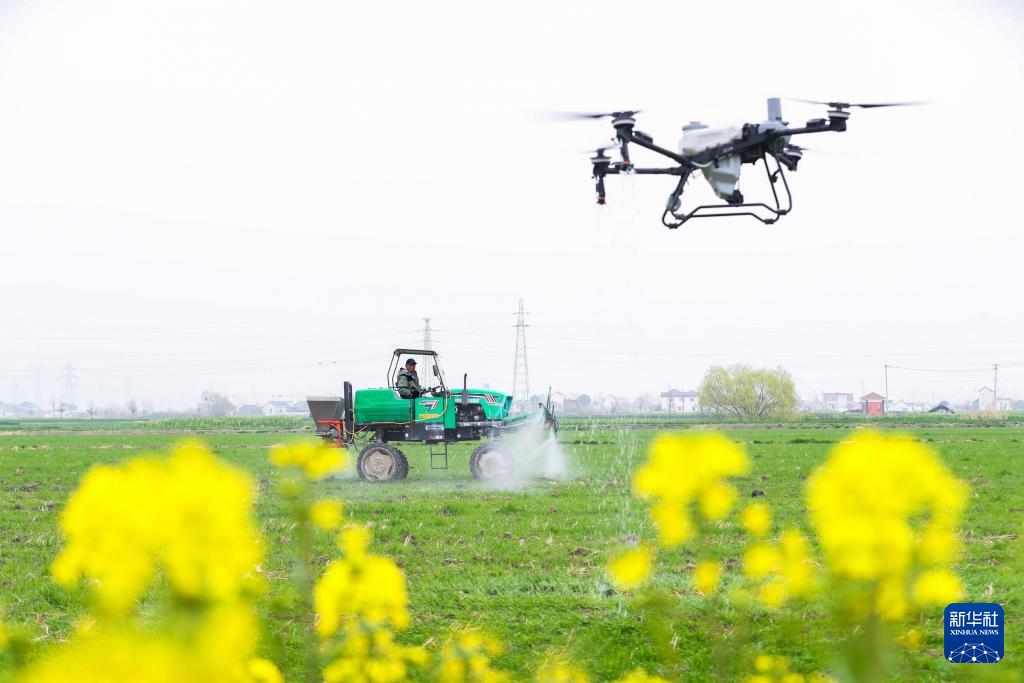 3月13日,在江苏省兴化市陈堡镇蒋庄村,农民驾驶植保无人机、自走式喷杆喷雾机实施杂草防治作业。