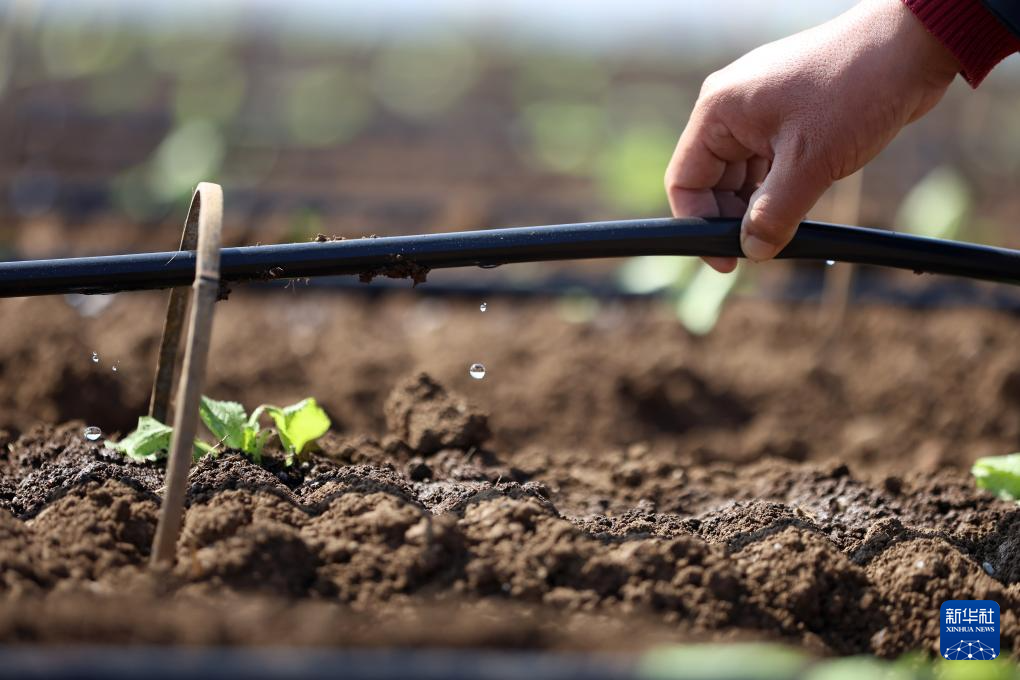 3月13日,在山东省临沂市郯城县郯城街道一处蔬菜种植基地,农民查看滴灌设备精准“补水”情况。
