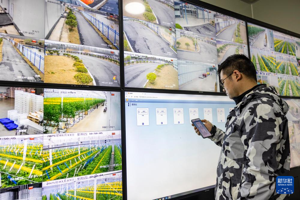 3月13日,技术人员在江苏省泰州市姜堰区溱湖智慧农业园数字化工厂通过远程智能温室控制系统,精准调控温、光、水、气、肥。