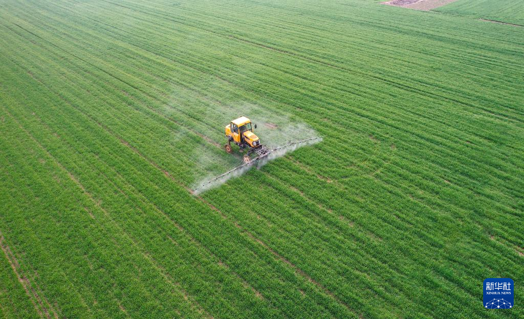 3月12日,在河南省夏邑县会亭镇崔楼村,装载着北斗导航系统的自走式植保机在麦田内进行喷药作业。