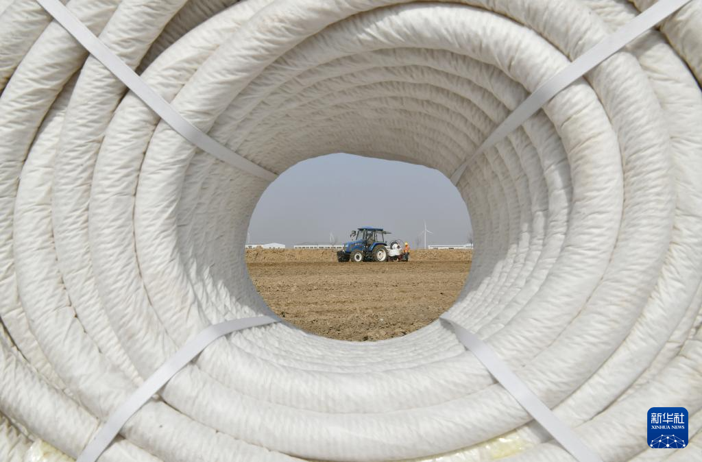 3月12日,工人在河北沧州渤海新区黄骅市林江农场铺设地下智能节水渗排系统。