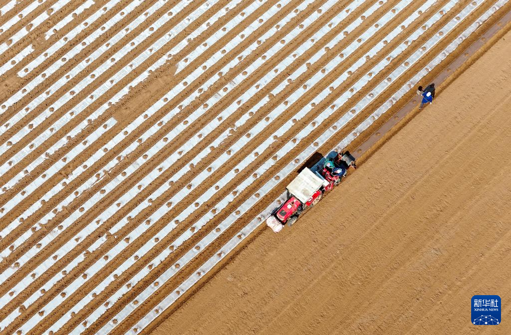 3月14日,在山东青岛西海岸新区六汪镇胶河马铃薯专业合作社春播现场,搭载北斗导航系统的马铃薯播种机在田间有序作业(无人机照片)。