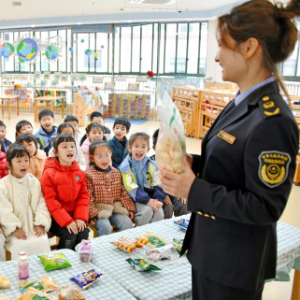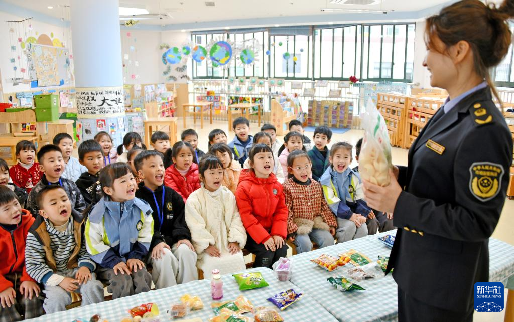 3月14日,在浙江省台州市仙居县中心幼儿园,市场监督管理局工作人员为孩子们讲解食品安全等方面知识。