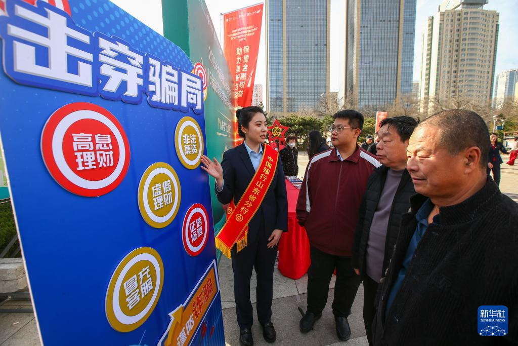 3月14日,在山东省济南市槐荫广场,银行职员为市民讲解金融领域反诈常识。