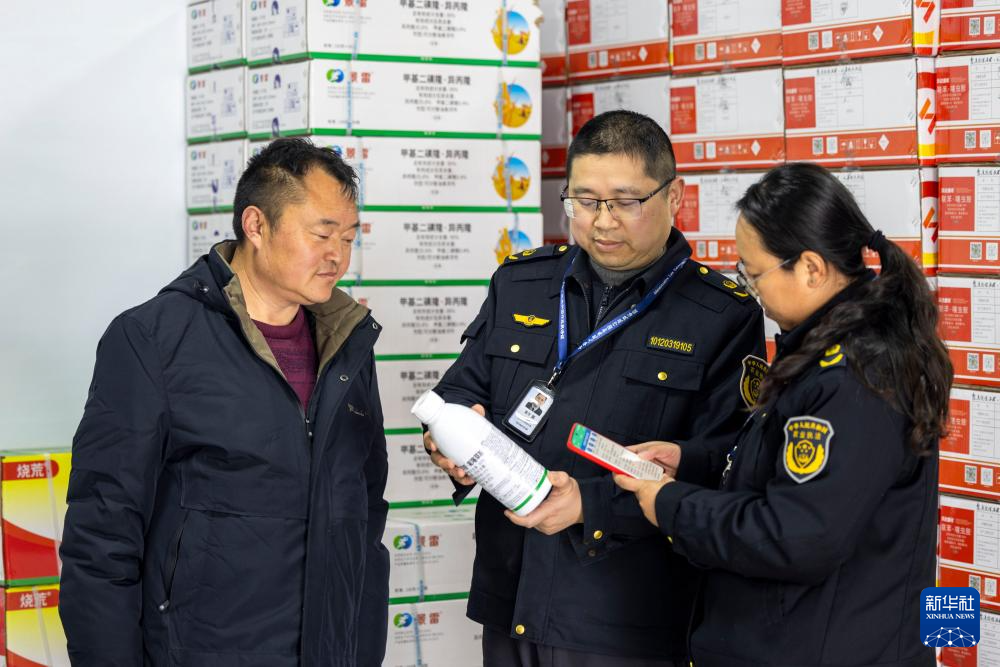 3月13日,江苏省泰州市姜堰区农业执法大队执法人员对顾高镇一家农资经营网点库存农药进行手机扫码检查。