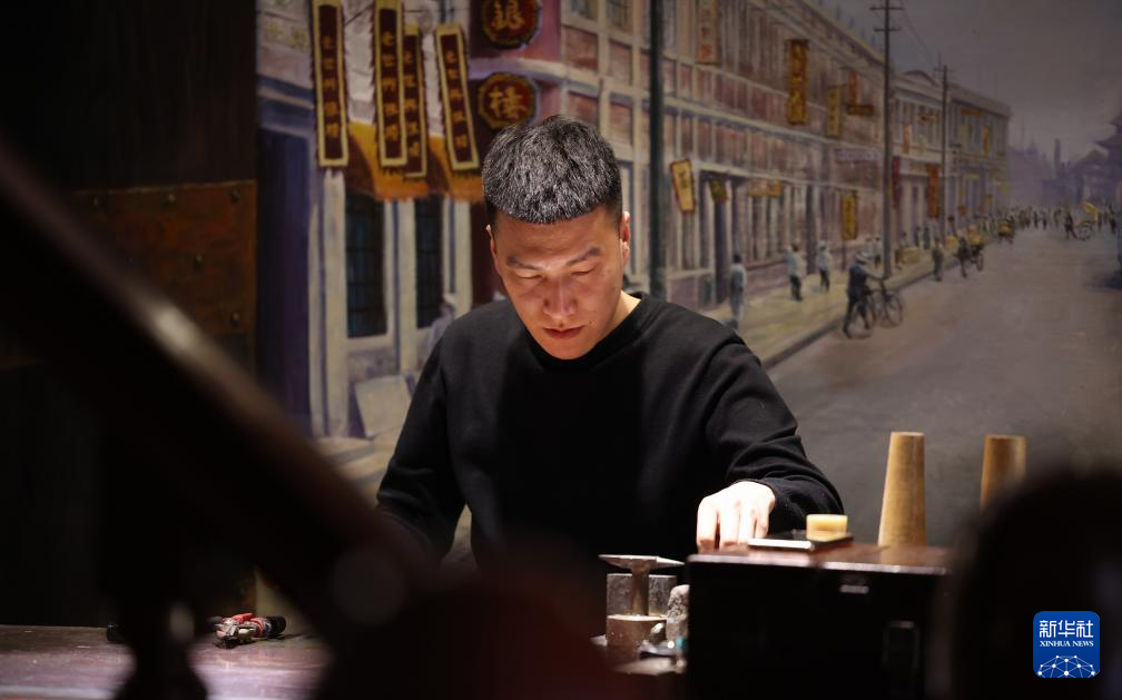 在辽宁省营口市辽河老街百年建筑老世兴银楼工坊里,作为辽宁省非遗代表性项目老世兴金银制作技艺第六代传承人的孙朋,忙着对银饰进行錾刻加工。
