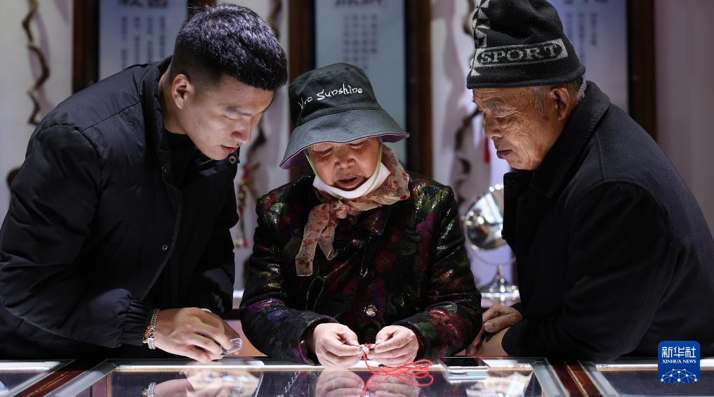3月13日,孙朋(左)为一对老年顾客介绍银饰。