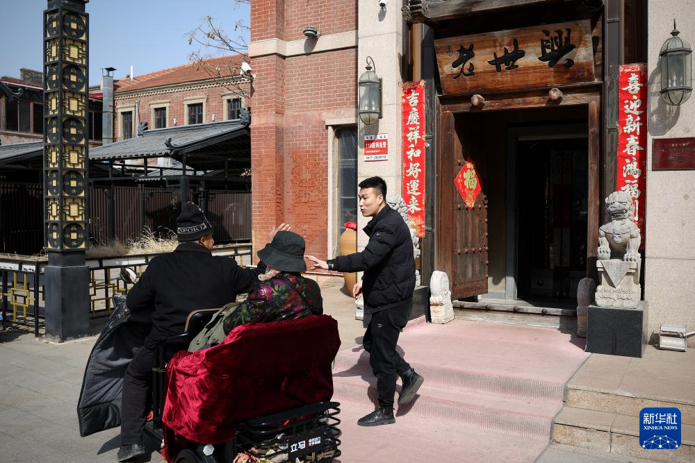 3月13日,孙朋(右)将一对来到店里订做银饰的老年顾客送出店门。