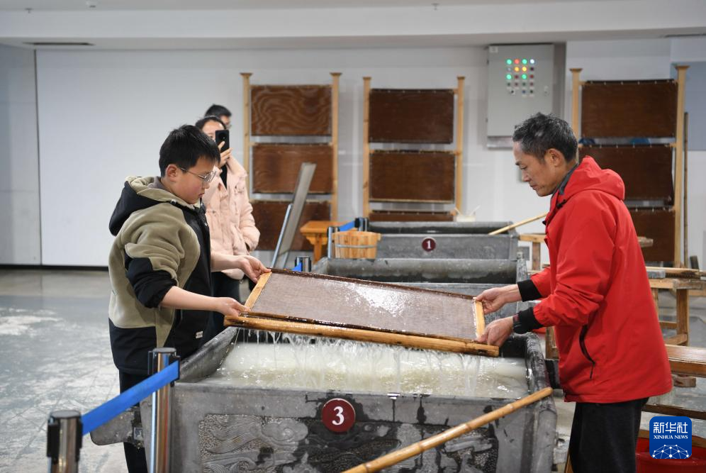 当日,不少游客走进安徽宣城市泾县宣纸文化园,近距离观看、体验宣纸传统制作技艺,感受传统宣纸非遗文化,乐享周末。