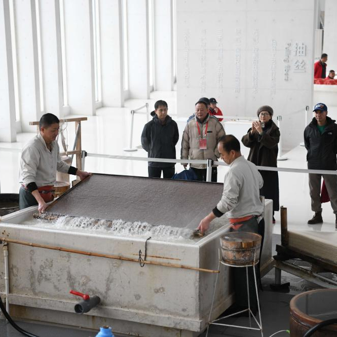 3月15日,游客在泾县宣纸文化园观看宣纸捞纸工艺展示。