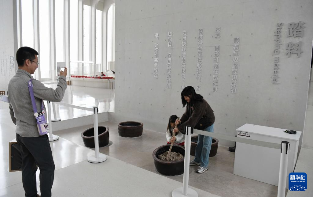 3月15日,游客在泾县宣纸文化园体验宣纸踏料工艺。