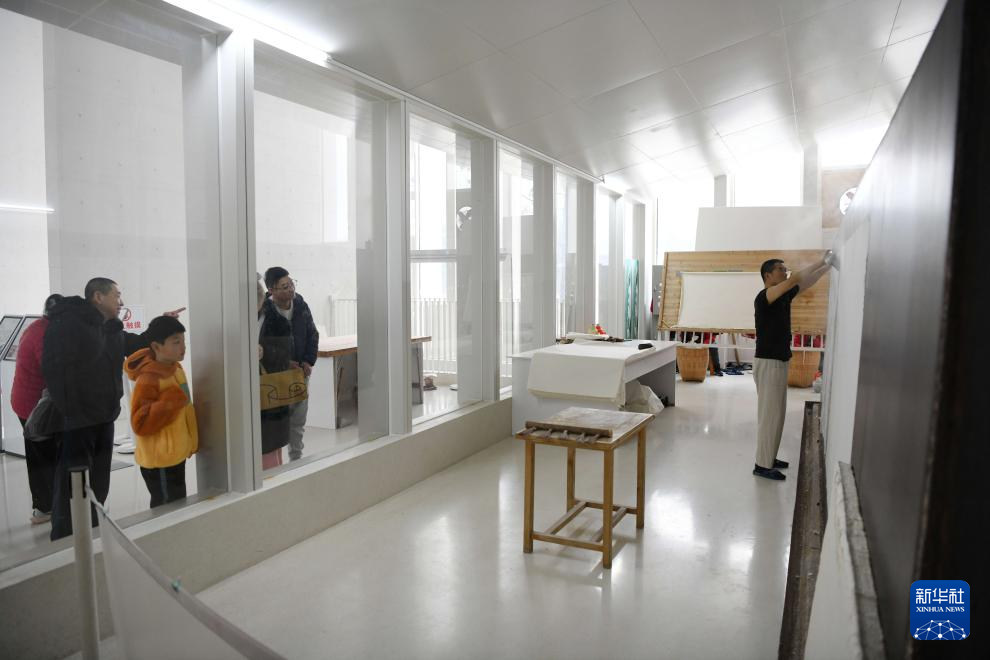 3月15日,游客在泾县宣纸文化园观看宣纸晒纸工艺展示。