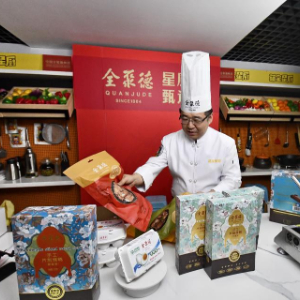 全聚德烤鸭店的年轻技师准备进行网络直播销售(3月13日摄)。
