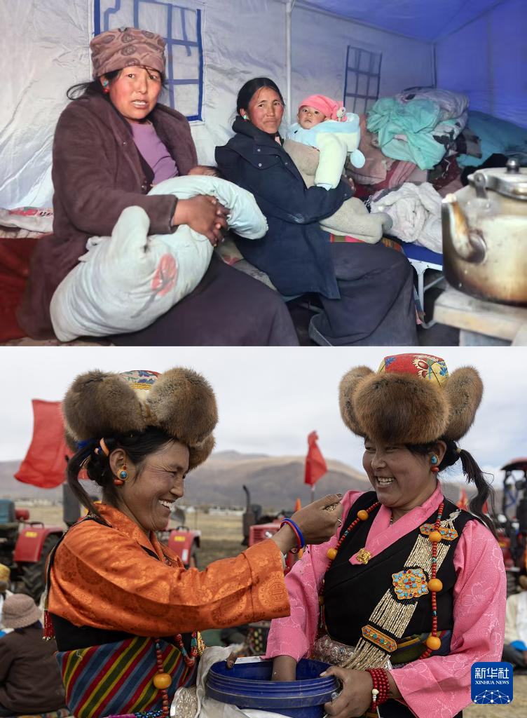 拼版照片:上图为西藏日喀则市定日县发生6.8级地震后,拉孜县曲下镇土林村受灾群众丹珍卓玛(右)和吉拉在临时搭建的救灾帐篷中(1月7日摄);下图为3月16日,拉孜县曲下镇土林村村民丹珍卓玛(左)和吉拉在春耕典礼上检查青稞种子。