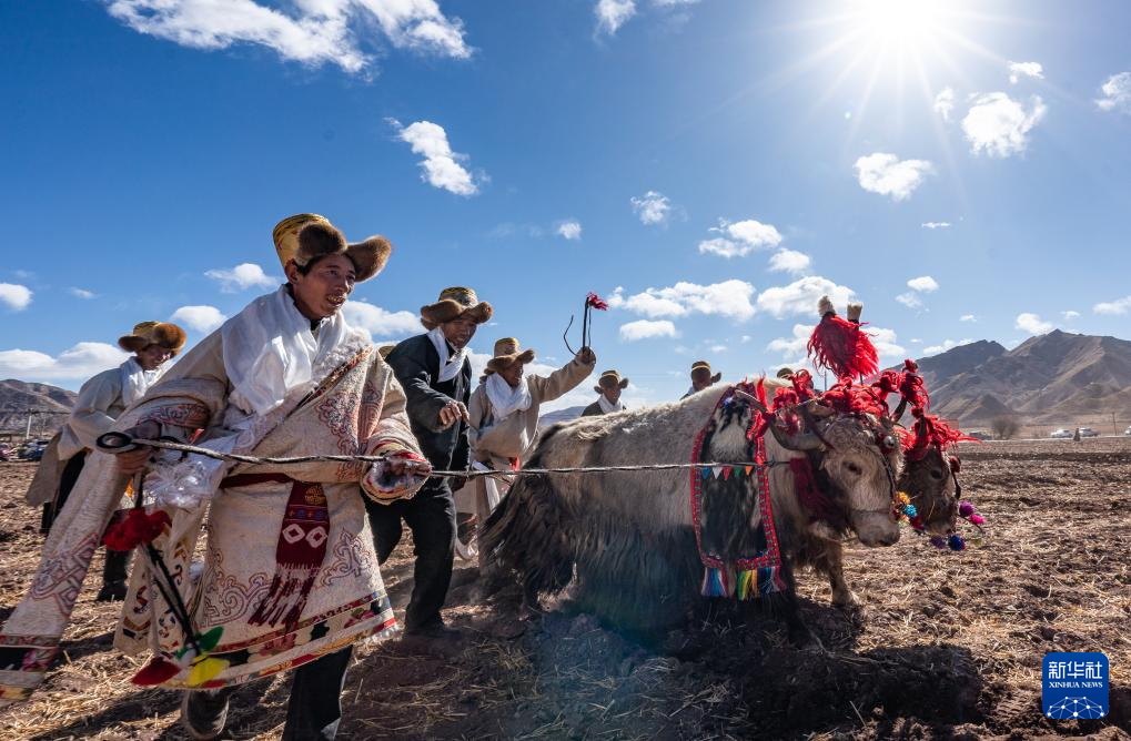 3月16日,在拉萨市林周县春堆乡春耕典礼上,农民沿袭传统,使用“二牛抬杠”的方式翻土犁地。