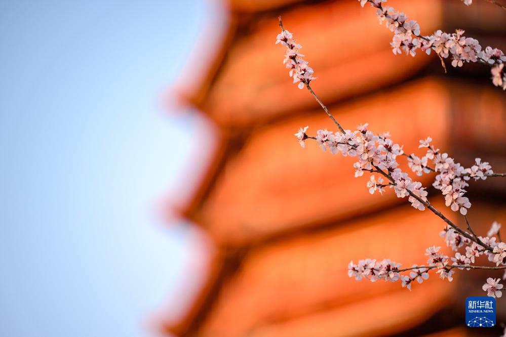 3月16日,北京园博园盛放的山桃花与永定塔相映成趣。