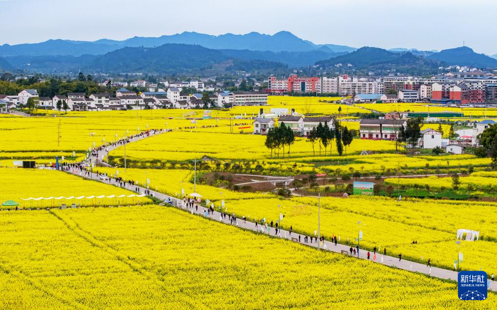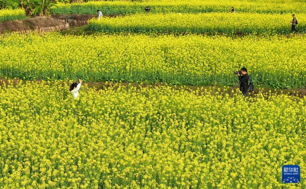 3月16日,游客在四川省广安市广安区花桥镇花桥村油菜花海中踏青赏花(无人机照片)。