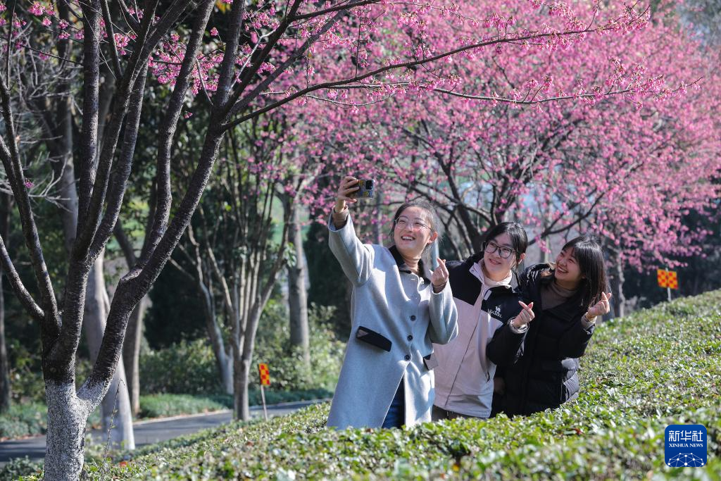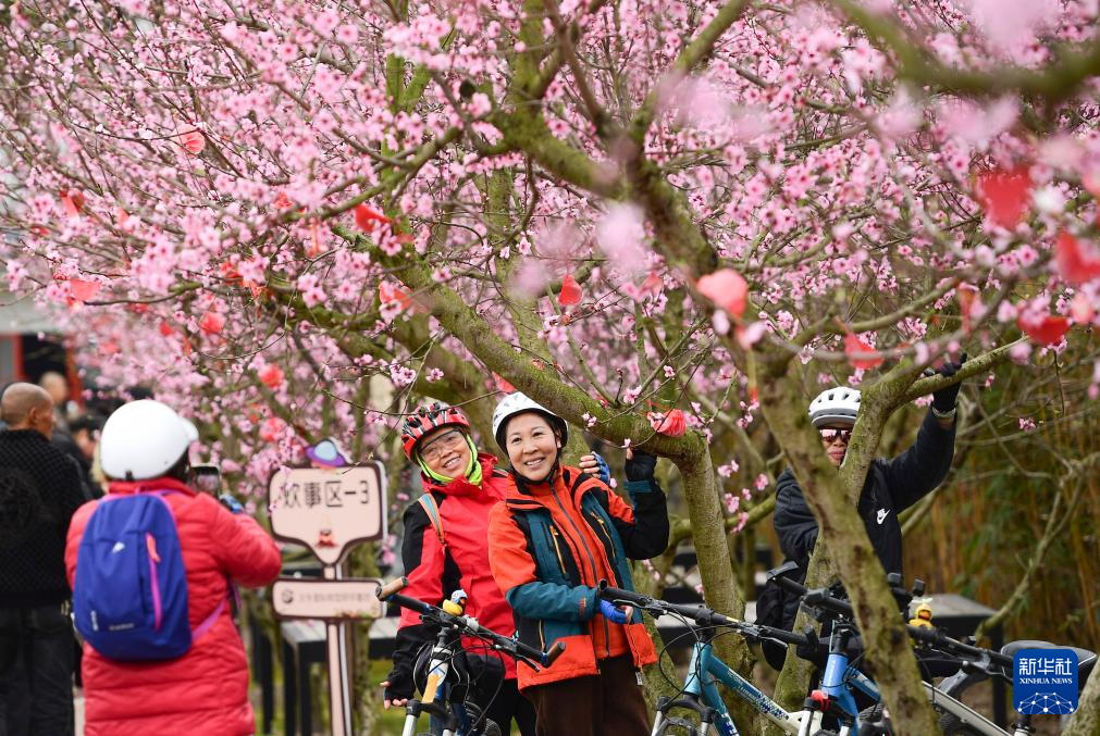 3月17日,游客在安徽省黄山市徽州区茶博园内踏春赏花。