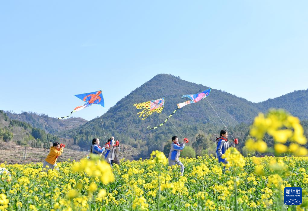 3月17日,浙江省台州市仙居县双庙乡中心小学学生在油菜花丛中放风筝。