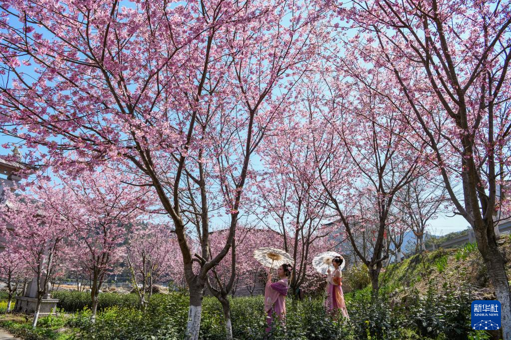 3月17日,身着传统服饰的游客在浙江省金华市磐安县双溪乡樱花长廊赏花游玩。