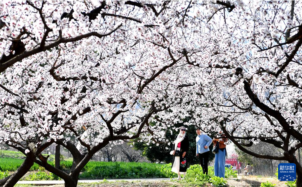 3月17日,在河南省驻马店市驿城区胡庙乡,人们在赏花游玩。