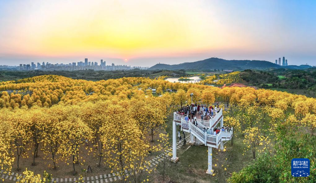 3月16日,游人在广西南宁市青秀山景区的黄花风铃园观景平台赏景(无人机全景照片)。