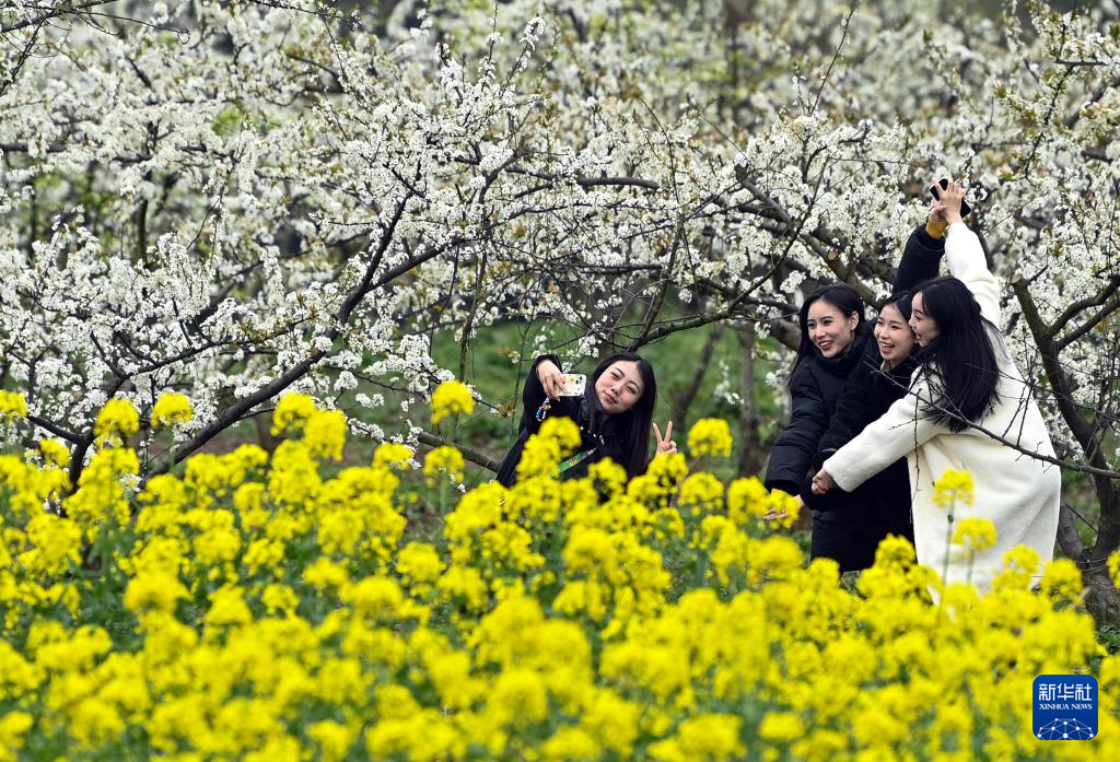 3月17日,游客在四川省南充市蓬安县新园乡宽敞沟村桃李产业园赏花游玩。