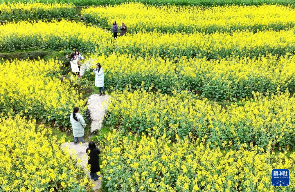 3月17日,游客在湖北省宣恩县长潭河侗族乡甘露村的油菜花田里赏花游玩(无人机照片)。