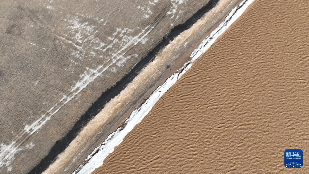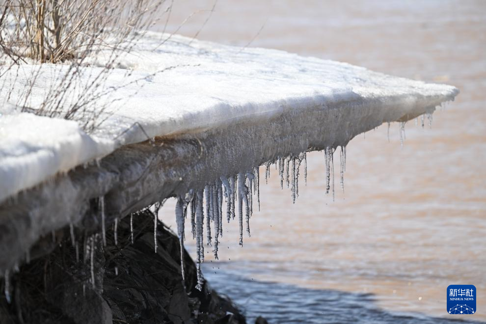 3月16日在内蒙古包头市拍摄的黄河岸边逐渐融化的冰。