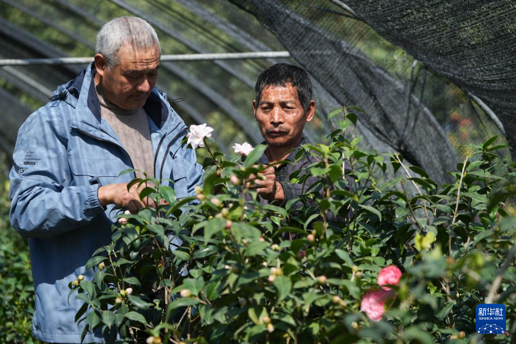 3月18日,在金华市婺城区竹马乡的种植基地,汪政团(左)和工人管护茶花。