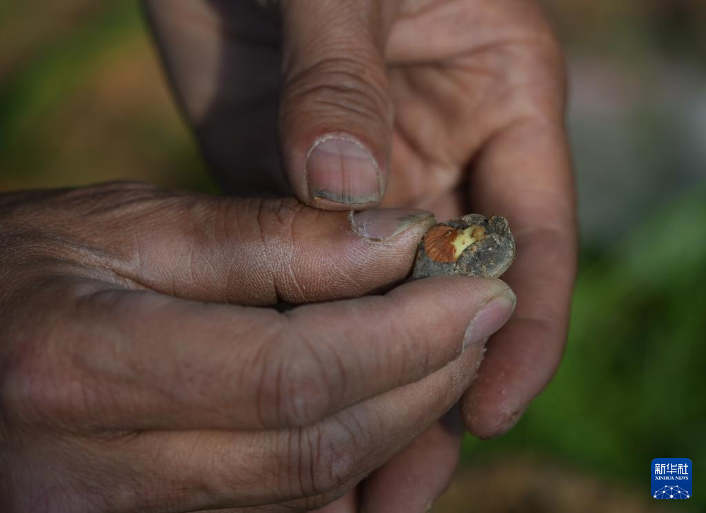 3月18日,在金华市婺城区竹马乡的种植基地,汪政团查看一粒已经发芽的杂交茶花种子。