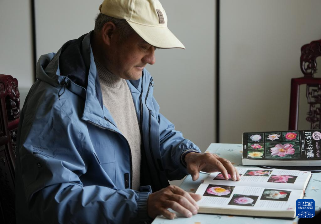 3月18日,在金华市婺城区竹马乡,汪政团在家中翻看茶花图册进行学习。