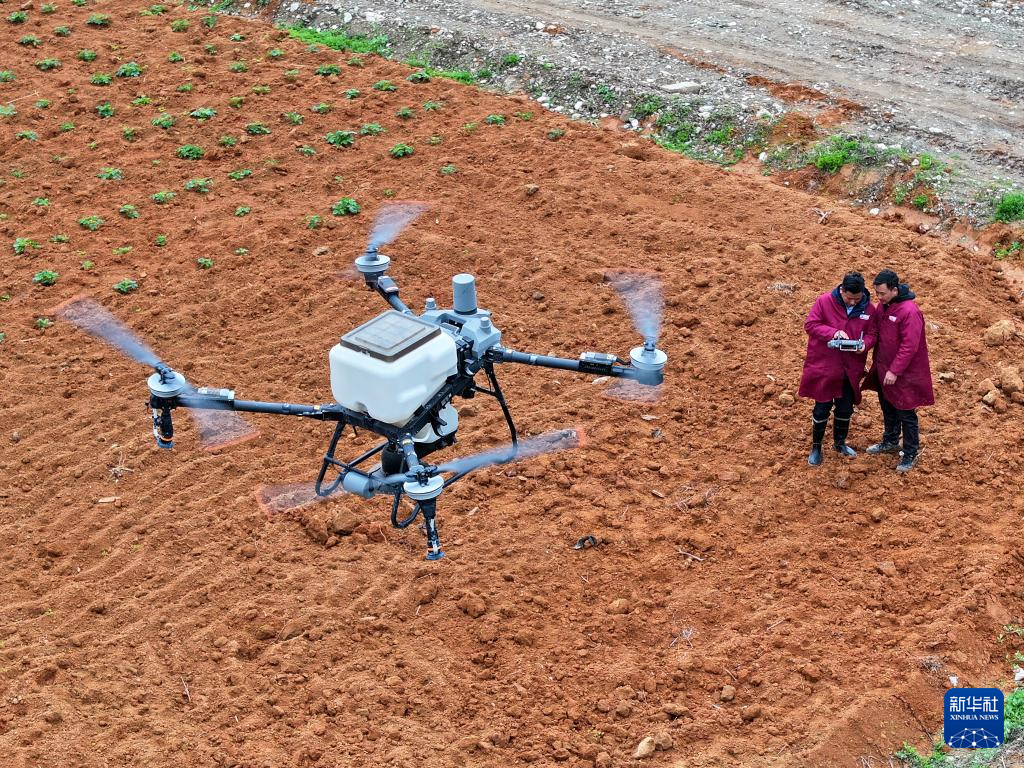3月18日,在重庆市梁平区回龙镇山河村香芋种植基地,技术人员在操作无人机喷洒底肥、防病虫药(无人机照片)。