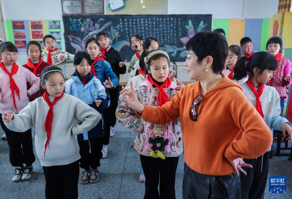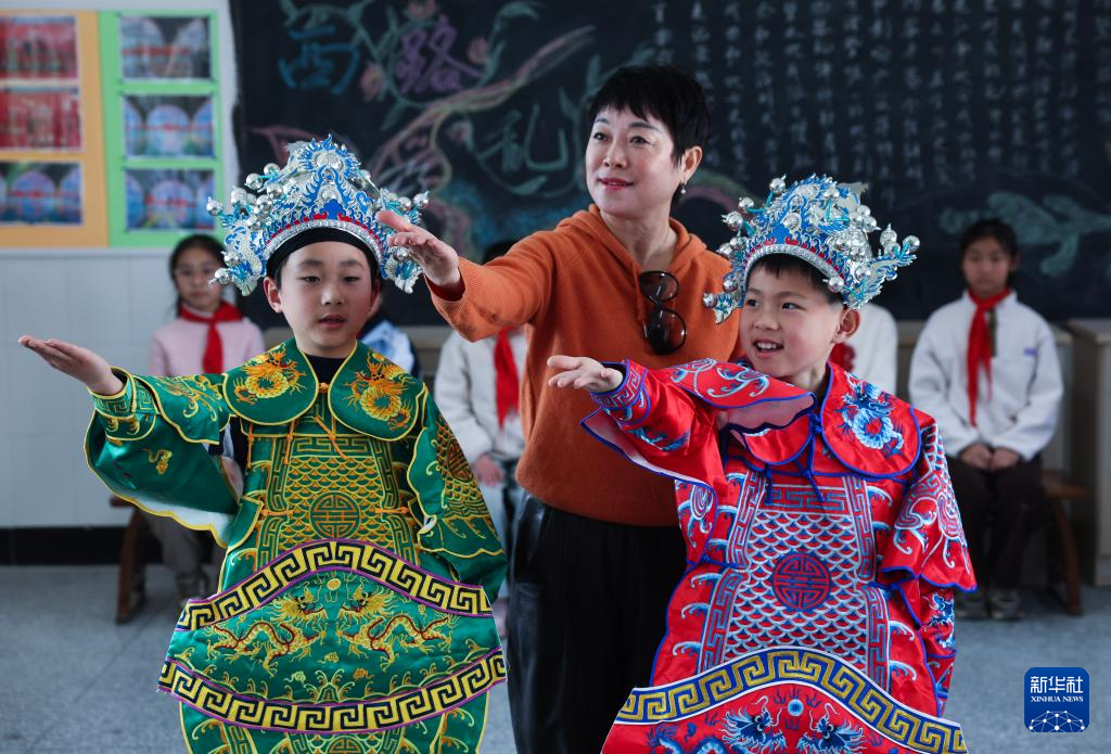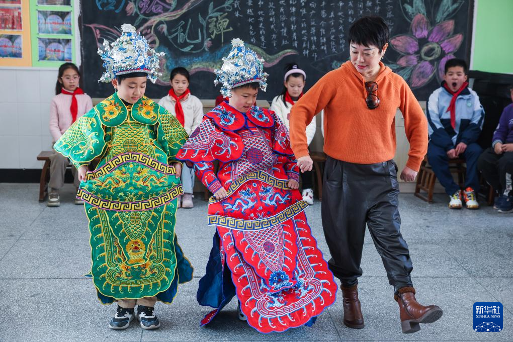 3月18日,东和乡小学西路乱弹传承特色班的学生在东和乡十里坪村文化特派员卓秋萍(右)的指导下学习西路乱弹的表演动作。
