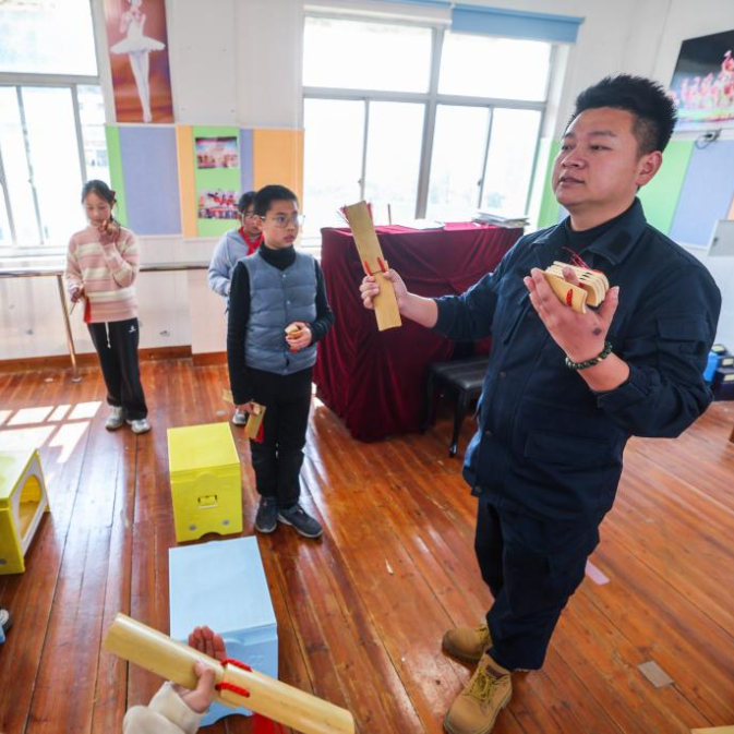 3月18日,东和乡小学西路乱弹传承特色班的学生在老师的指导下学习西路乱弹竹板课程。